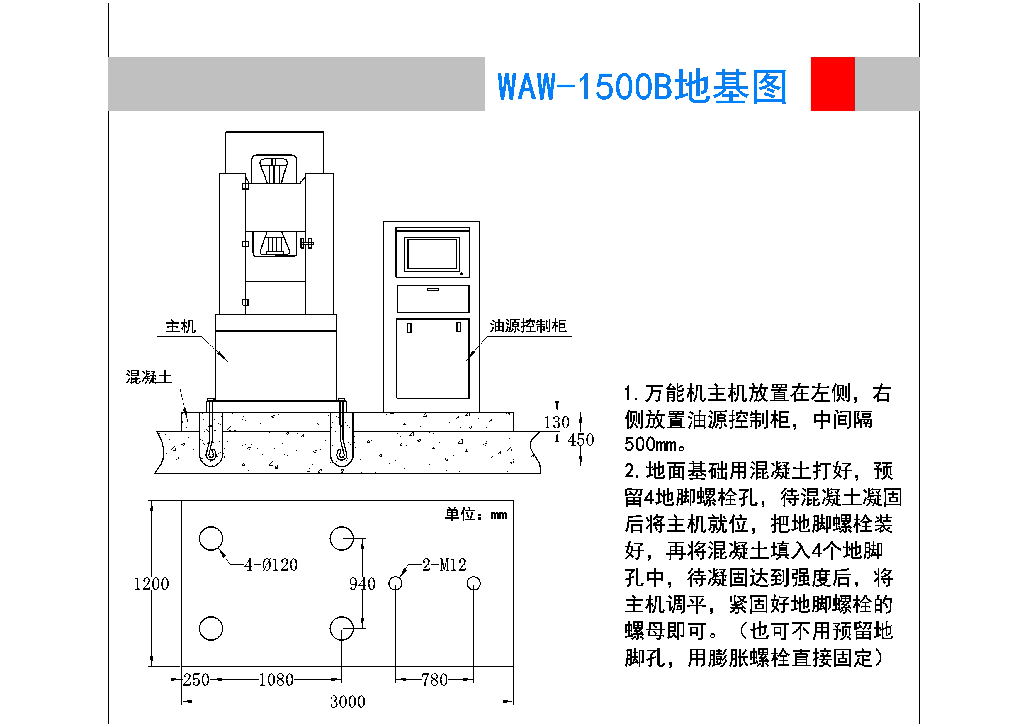 WAW-1500B型电液伺服万能试验机是采用了液压动力源驱动,电液伺服控制技术, 计算机数据采集处理,可实现闭环控制及自动检测的高精度材料试验设备,其由试验主机、油源(液压动力源)、测控系统、试验器具四部分组成,试验力1500kN。