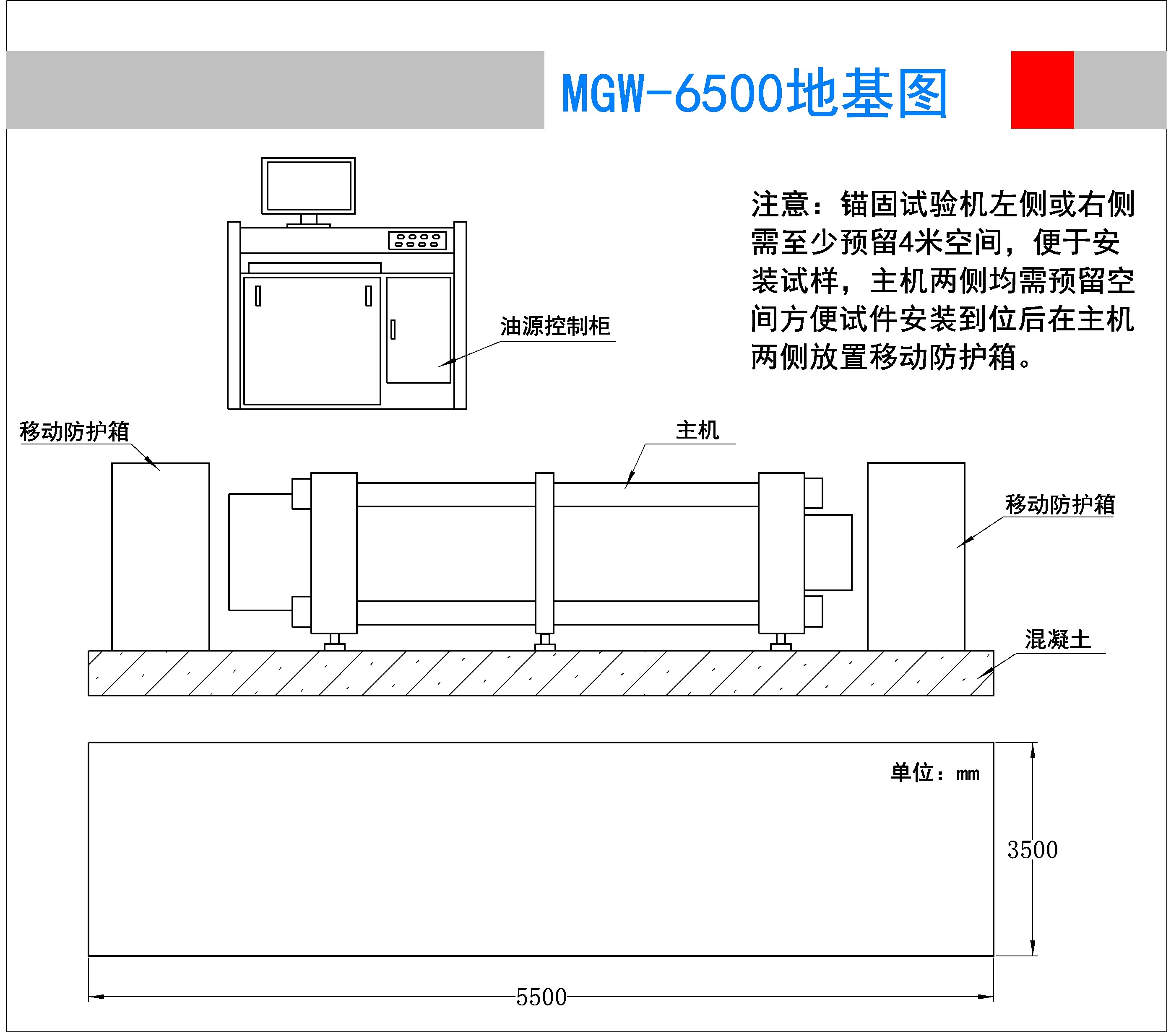 MGW-6500型微机电液伺服静载锚固试验机是采用了液压动力源驱动,电液伺服控制技术,计算机数据采集处理,可实现闭环控制及自动检测的高精度材料试验设备,其由试验主机、主油源(液压动力源)、移动油源(预紧油源)、防护箱四部分组成,试验力6500kN,试验机准确度等级优于1级。